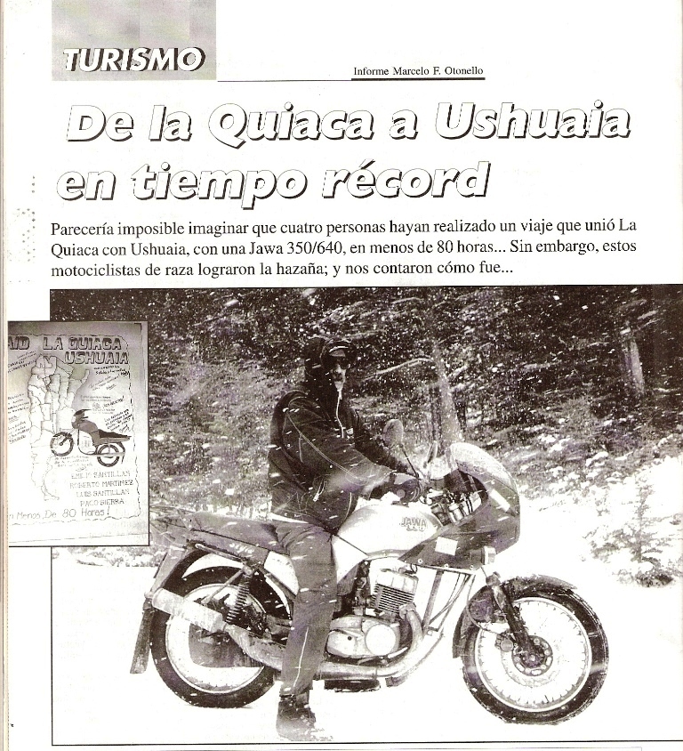 A pesar de que pocos creían que esto era posible en una JAWA 350 año 1992 (modelo 640) la proeza fue lograda de la siguiente manera: Una JAWA 350, un automóvil Peugeot 504 y un equipo de 4 personas: Luís Santillán, Emilio Santillán, Francisco ¨PACO¨ Sierra y Roberto Martínez.