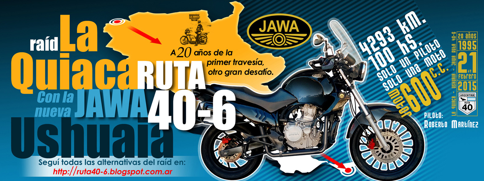 Este era el lema que Roberto siempre defendió y el que proponía demostrar, ¨JAWA ES LA MOTOCICLETA CON MEJOR RELACION PRECIO PRESTACIONES DEL MERCADO, LA MAS ROBUSTA Y CONFIABLE. Para demostrarlo, su propuesta fue unir los puntos extremos de Argentina en tiempo récord: LA QUIACA – USHUAIA EN MENOS DE 80 HS.