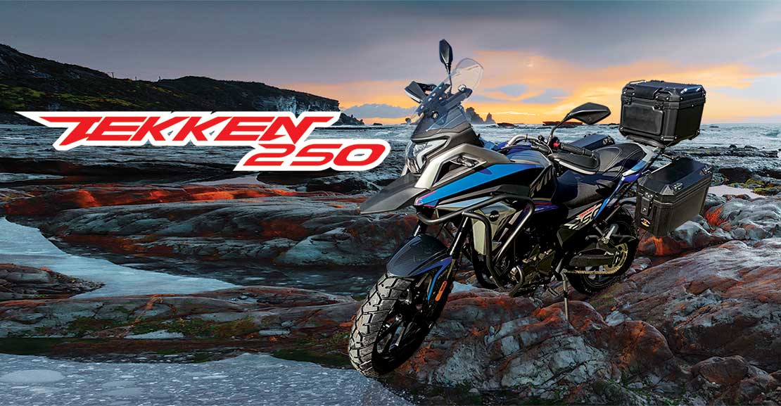 La Tekken 250 nueva generación se presenta como una motocicleta doble propósito renovada, diseñada para combinar el uso diario en la ciudad con las aventuras off-road. Equipada con un motor monocilíndrico de 249.4 cc y 4 válvulas, refrigerado por aire y radiador de aceite. Destaca por su estética Adventure con horquilla invertida, iluminación full LED, cubrepuños con DRLs LED, tablero digital de 6.5 pulgadas y equipada completamente para salir a la ruta con parabrisas integrado, set de 3 valijas, caballete central y sistema de defensas bajo y alto.